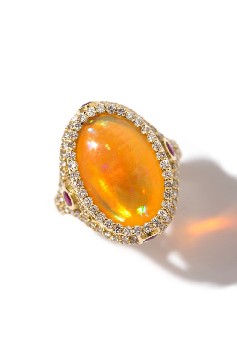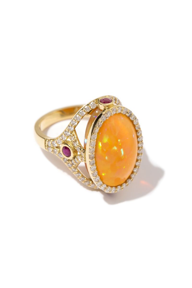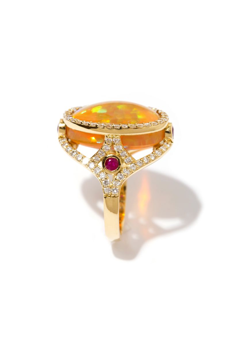 Yakutun tutkusu, opalin düşsel ışığı ve pırlantaların sonsuzluğu bu yüzükte buluşmuşlardır.